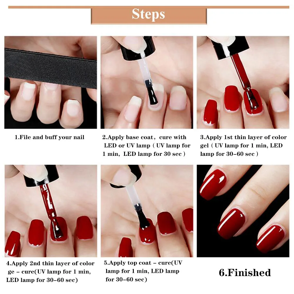 Step 4. Apply polish directly, cure with UV lamp for 2-3 minutes or cure with LED lamp for 60 second; when dry,apply the 2nd layer and cure with UV lamp or LED lamp again.